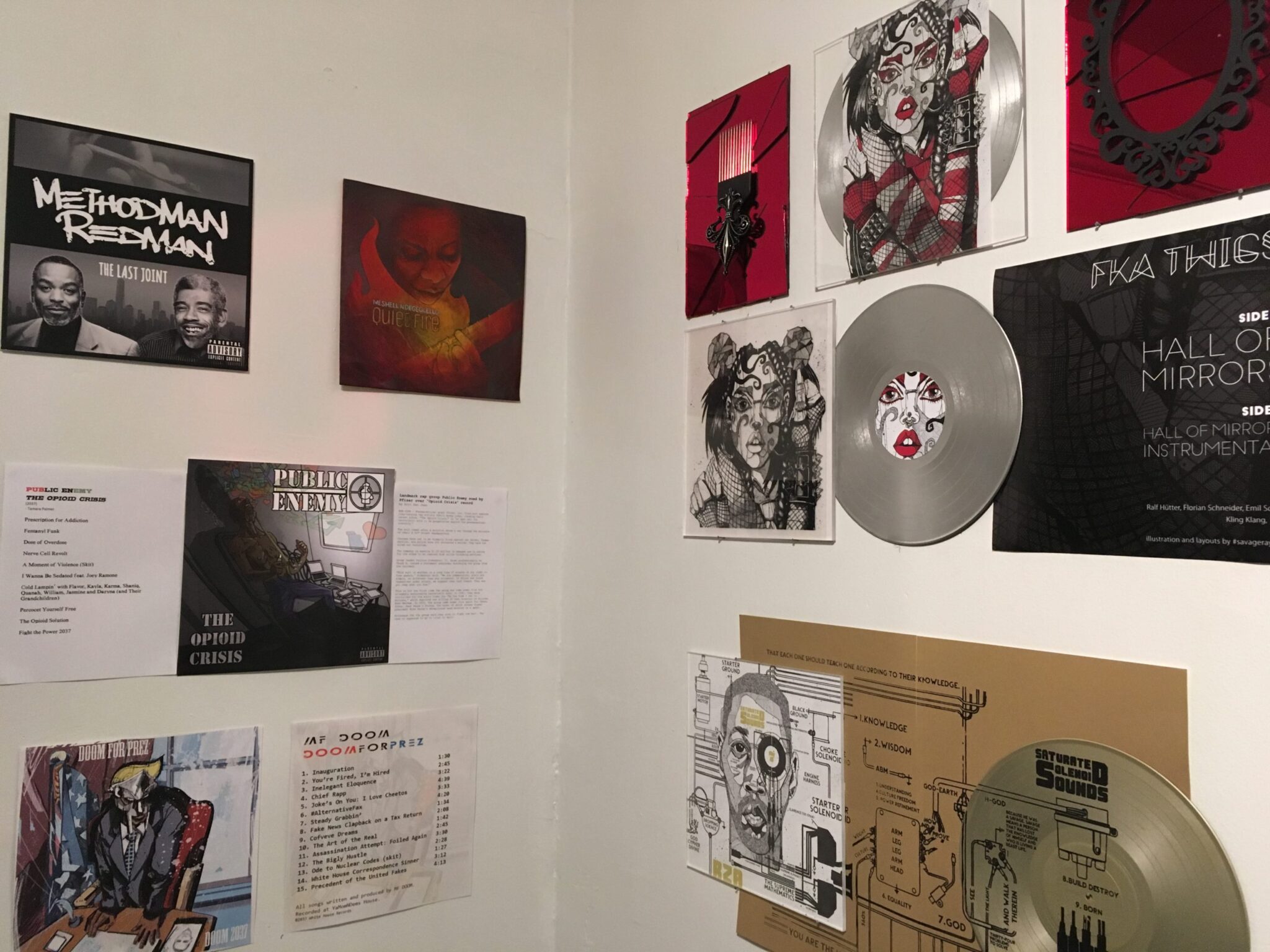 The organization hosts exhibits, too, and on Saturday the gallery space was filled by a group show titled “Wrecka Playa – Album Art in 20 Years.” Though the exhibit was billed as a visual art installation featuring “album cover art as realized by visual and literary artists for music 20 years in the future,” once inside, I found that it was that and much more. Participatory artists built worlds of content for each album: backstories, liner notes, scandals, and celebrations.