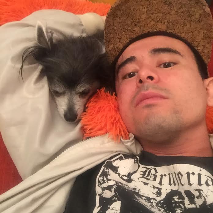 ME: Rocco Noah Katz Cacciatore (Rocky for short) is my long-haired Chihuahua/werewolf who is presently approximately five years old. Me and my partner of the time adopted him a little over two years ago. Took him home on March 11th, 2016. So that’s when we celebrate his birthday, which technically makes him a Pisces. Oy, what can(’t) I say about my little doofus? He’s a bit of a troubleman. He can go from being the sweetest, bubbliest, belly rub-loving Furby to a nasty curmudgeon with an axe to grind in a matter of seconds. He is such a fierce guardian of what he deems his territory, which at this point is like six blocks in every direction from my house. Gets a little frustrating sometimes, like he’ll go lunging out of the blue at a stranger’s ankles without warning, but all in all I have learned to manage him and we’ve really made strides in keeping his aggression in check (no one that knows him/me will fully agree with that, heh). But I appreciate this mercurial nature of his. He is my child and I only wish for him to express himself however he feels fit to! Just, he was in a really awful situation for the first part of his life, which I don’t want to get into the specifics of or I will not be able to continue on this interview, so fucked. Thankfully he was surrendered by whomever was (not) caring for him and I just try my darn best to make a life for him that is the awesomest he can possibly have. Maybe someday we will live out in the country and he will have acres upon acres to claim as his own. That’s the dream. He goes nuts for an open field of tall grass. He is keen on soft surfaces and squeaky toys, aggressively befriending dogs four times his size or more (not so much interested in dogs his own size/breed), sleeping with his butt pressed firmly up against your (my) butt, sharing mushy bananas and string cheese with me (you), nosediving into bird poop and dead worms, and watching skate videos. He hates rain but loves getting the hairdryer treatment. He always smells so goddamn good (save for the Chihuahua breath, of course). He is going dress up as Sid Vicious this coming Halloween. I call him Walter when he acts distinguished. He has pretty intense dietary limitations, kind of a bubble boy. He is allergic to, among various other things, beef, pork, fish, wheat, potatoes. Craziest thing is that he’s allergic to COTTON. Took a really comprehensive allergy panel to determine all this and my vet in Queens was even kind of baffled about the cotton thing. Like, he’s gotten pretty bad dermatitis by sitting on cotton sheets just for a brief period of time. But we manage! I’ve got to say, polyester bedding gets a bad rap. It is actually quite soft and breathable. Me and Rocky are both incredibly comfy at night thank you very much.