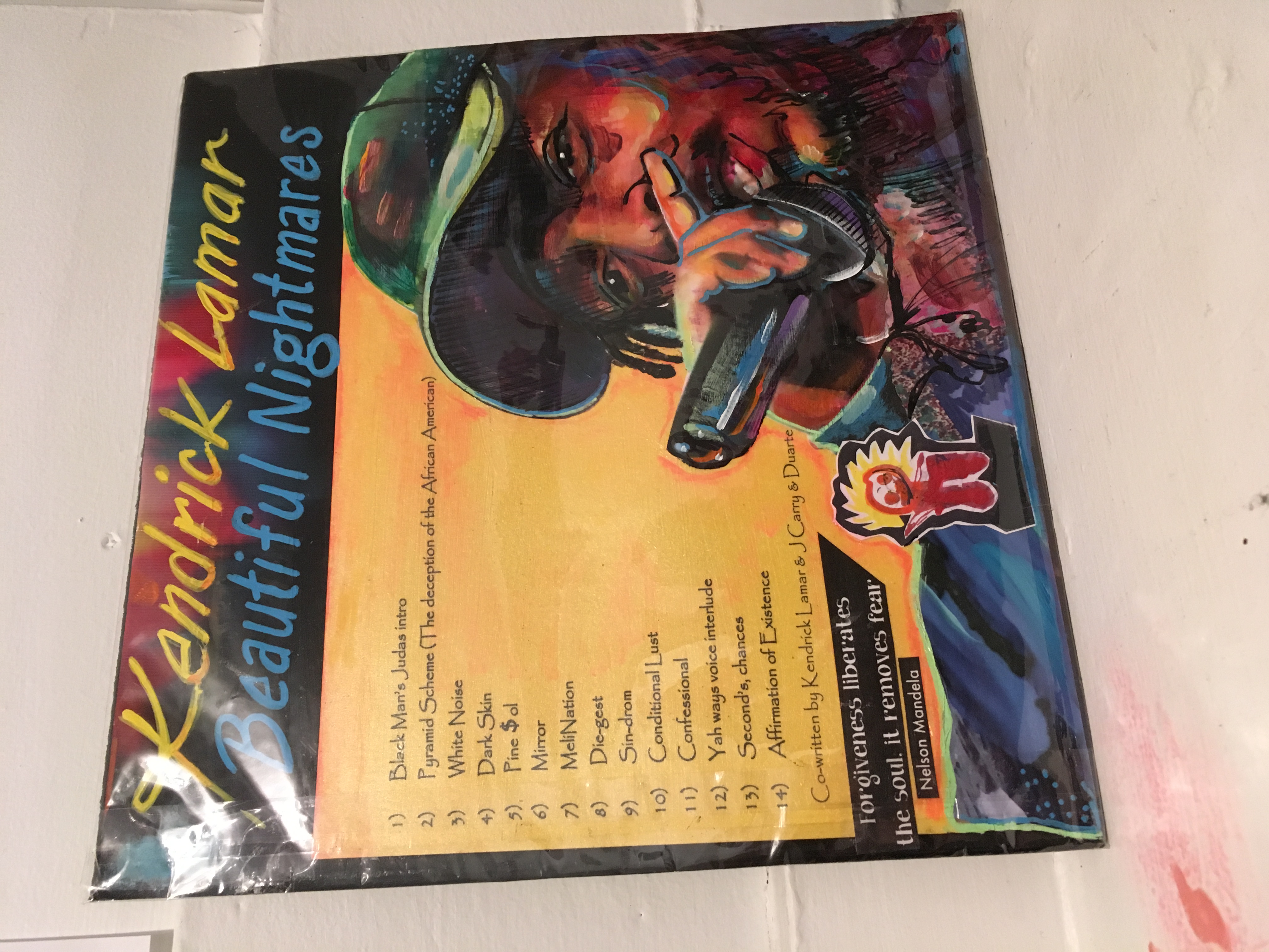 Inside the gallery, the imagined album covers were diverse, ranging from traditional paintings to collage to digital art. Each was accompanied by written content, though the length and breadth of that content differed. Some, like local writer Hanif Abdurraqib, wrote entire essays – in Abdurraqib’s case, describing a future Future album, Sensational. Across the room, Eric San Juan asked the viewers if a Radiohead album was still a Radiohead album if it was created by just one man, and Beyoncé, tired of the upkeep that comes with constant performance, releases an album with Jack White. Prince and Micheal Jackson released a lost session of music (the making of which generated countless conversational gems), and Jay-Z made an album called 8:88.