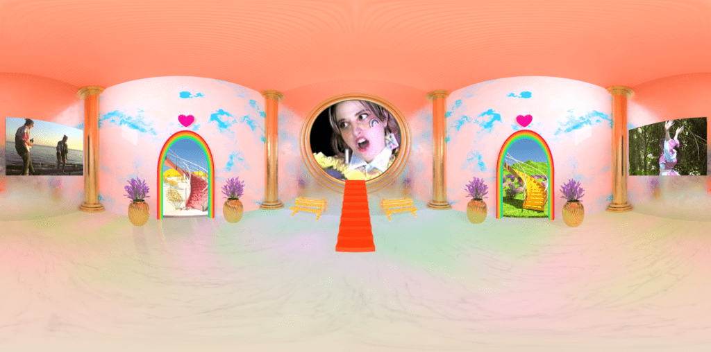 Jena Pyle has designed a music video like no other for “Find Ur Grind,” her recent collaboration with Jack Uppling’s solo project, Seattle Listening Party. Beyond writing the lyrical content and singing on the track, Pyle, who is also a professional illustrator and designer, created a fantastical and interactive lofi-meets-vaporwave 3D space in which she, Uppling, and other musicians on the track sing and dance in elaborate outfits designed by artist Janelle Abbott. By clicking and dragging in the frame of the video, listeners can move 360 degrees around a vibrant, cloud-covered room; on the walls, Pyle installed rainbow-arched doorways, realistic metallic flower planters, gold pillars, and several framed screens with performance clips.