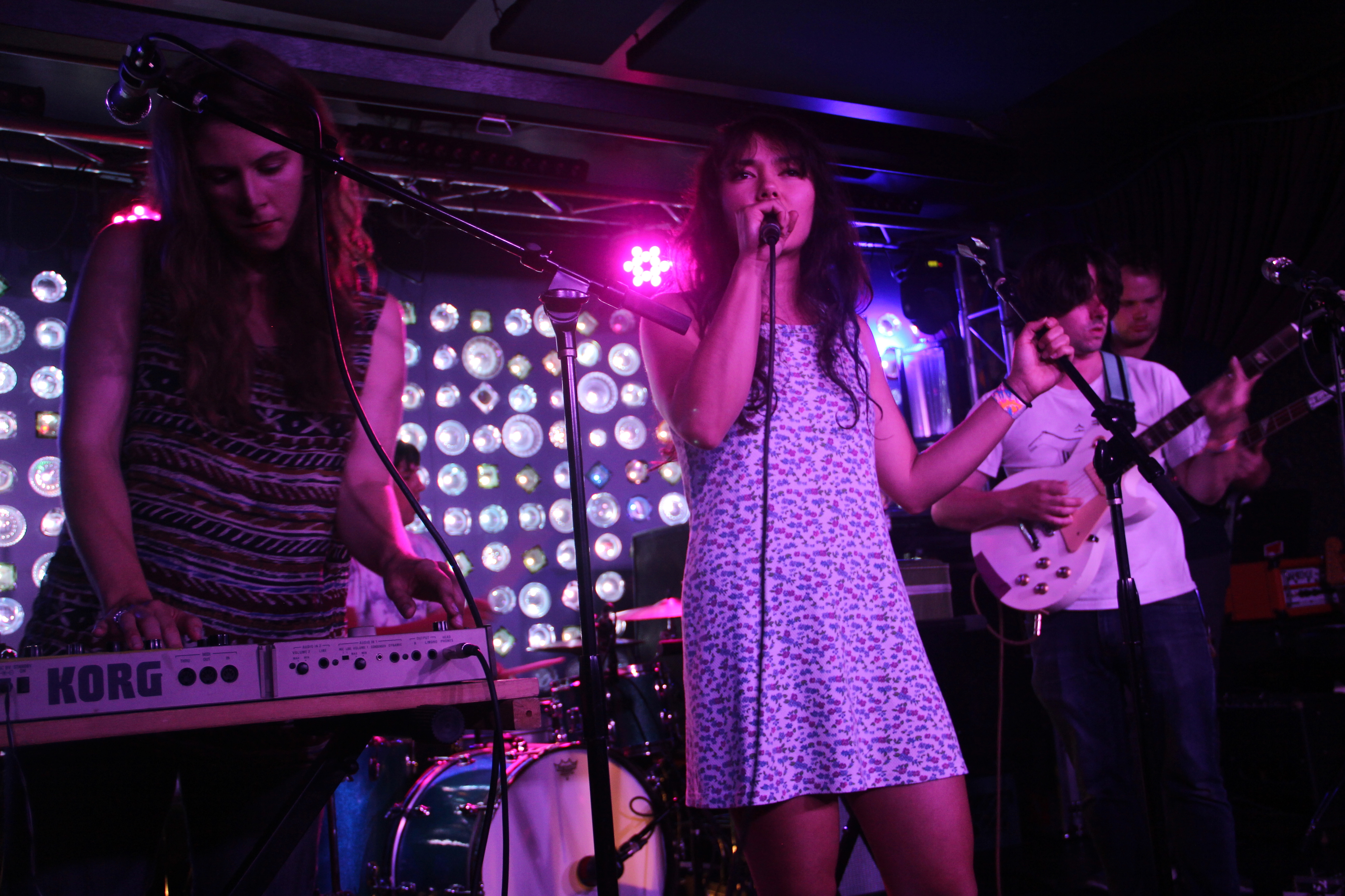 A little after 11 p.m. on Saturday night, the band opened their sold-out set at Baby’s All Right, bursting in with the biggest number from the album, “In Love With Useless.”Vocalist Jen Goma (who moonlights in People Get Ready and The Pains of Being Pure at Heart) bounced up and down, seemingly drawing all her energy to guide the song through its twists and turns, on a path leading to a clarifying harmony with the more restrained vocals of Annie Frederickson. Though the band is a sixpiece, it was the two women at the front who commanded much of the attention. Goma, the only one unfettered by an instrument, made for a very physical presence, and seemed to be using her entire body to conjure the big notes. Frederickson, for her part, would widen her eyes in anticipation of the soaring harmonies they reached for, the two women sharing a grin when they made it.