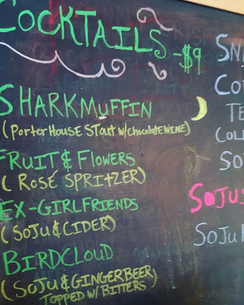“One thing I love about being a booking manager and also a touring musician is that I get to help bands we’ve played with on the road. We recently had Blaha from Minneapolis; one of their members put us up while we were out there. Today we had Cult Flea Market Twisted Christmas edition which, yes, is a Flea Market for horror and weird cult stuff. It was put on with Mike Hunchback from Co-Op 87 Records (cool record store in Greenpoint). I picked up a Wanda Jackson Record and a weird novel about lust and blood with Cavewomen. I’ve made cocktail menus of women-fronted bands; you can get a Birdcloud or a Sharkmuffin.