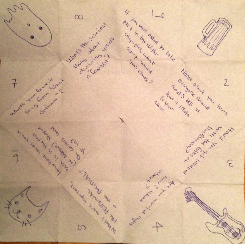 At the second night of a three-part Don Giovanni showcase last Friday, we caught up with three of the New Brunswick-based punk label’s brightest and best. We also decided to pioneer a new interviewing technique based on a popular children’s fortune telling game, using a folded paper “cootie-catcher” (or “saltcellar” or “chatterbox” or “whirlybird” or whatever you may have called it).