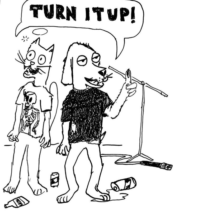 AF: I know you dabble in comics on the side of your music and teaching careers. Are Carlos Rock Dog, Kitty Cat, or Denim Frog based on any real animal or human pals?