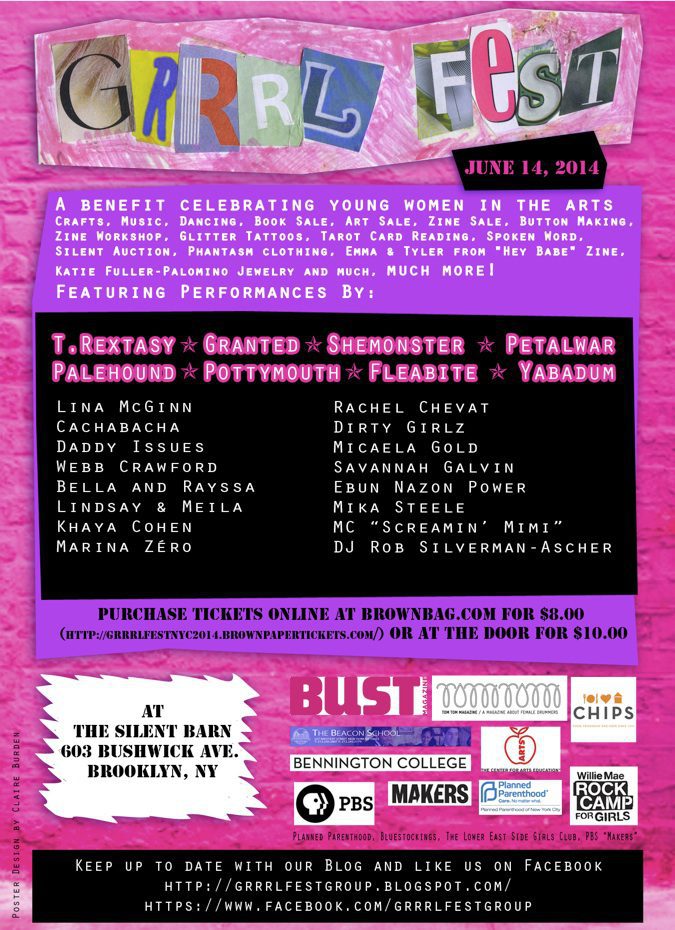 Bridget: The sponsors for the event really happened so easily. First I have to say The Beacon School has truly supported this from the start. In addition, the people over at Silent Barn were behind this idea from the beginning. Nat Roe has been a dream to work with. He has been with us every step of the way and has supported pretty much anything we sent his way. He was the one that suggested we take the event into the night and have Pottymouth and the rest of the bands play later on in the evening. Originally it was going to be a six-hour event but now it’s about a twelve-hour event! As for the rest, we literally got on the phone and made calls or emailed people we thought could add to the event. BUST Magazine and Tom Tom Magazine were some of the first to back us up. Then Bennington [fusion_builder_container hundred_percent=”yes” overflow=”visible”][fusion_builder_row][fusion_builder_column type=”1_1″ background_position=”left top” background_color=”” border_size=”” border_color=”” border_style=”solid” spacing=”yes” background_image=”” background_repeat=”no-repeat” padding=”” margin_top=”0px” margin_bottom=”0px” class=”” id=”” animation_type=”” animation_speed=”0.3″ animation_direction=”left” hide_on_mobile=”no” center_content=”no” min_height=”none”][College] came in with a generous donation. They really supported us from the minute this whole idea began. Libby Hux was a huge player at Bennington she literally got right on it and made calls and wrote to people to make that happen. As for Planned Parenthood, Lower East Side Girls Club, Bluestockings, Center for Arts Education, CHiPS, Willie Mae, Makers… we just reached out and asked if they would want to participate. They all said yes! We were thrilled! We even had some people contacting us once people got word of the event.