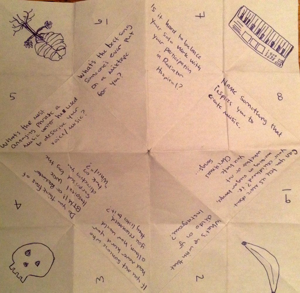 At the second night of a three-part Don Giovanni showcase last Friday, we caught up with three of the New Brunswick-based punk label’s brightest and best. We also decided to pioneer a new interviewing technique based on a popular children’s fortune telling game, using a folded paper “cootie-catcher” (or “saltcellar” or “chatterbox” or “whirlybird” or whatever you may have called it).