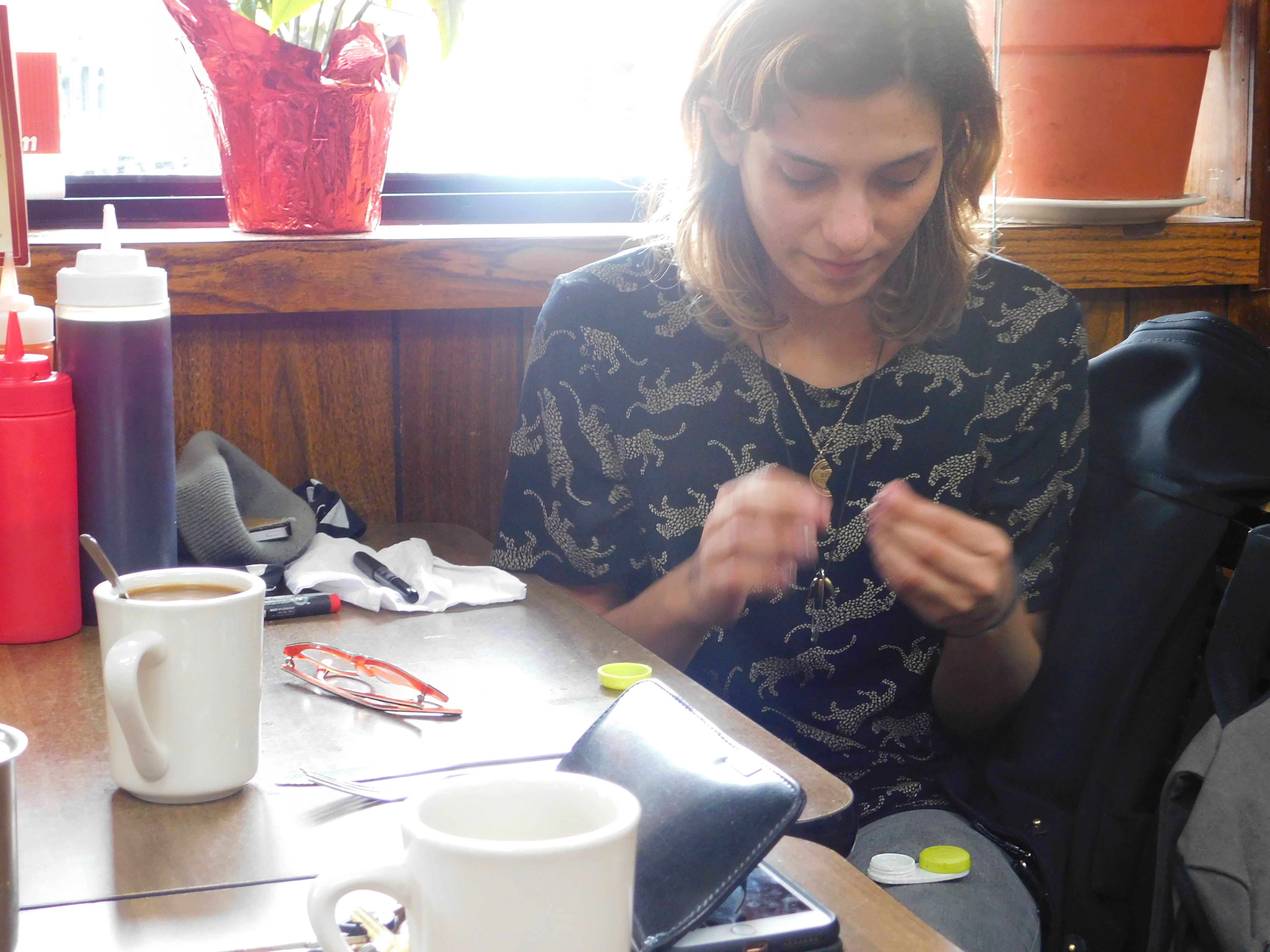 11:43 Caro and Ana order eggs and grits, Jose orders French toast with ham, I get a feta cheese omelette, and Lyzi… isn’t here yet and is either meeting us at the restaurant or at Pickthorn, where the gang is getting makeovers for the Color Me Bushwick Festival. Obviously I’m tagging along because free makeovers is the kind of pseudo-glam musician activity I love to lurk on. Not that the gang is so typically fancy.